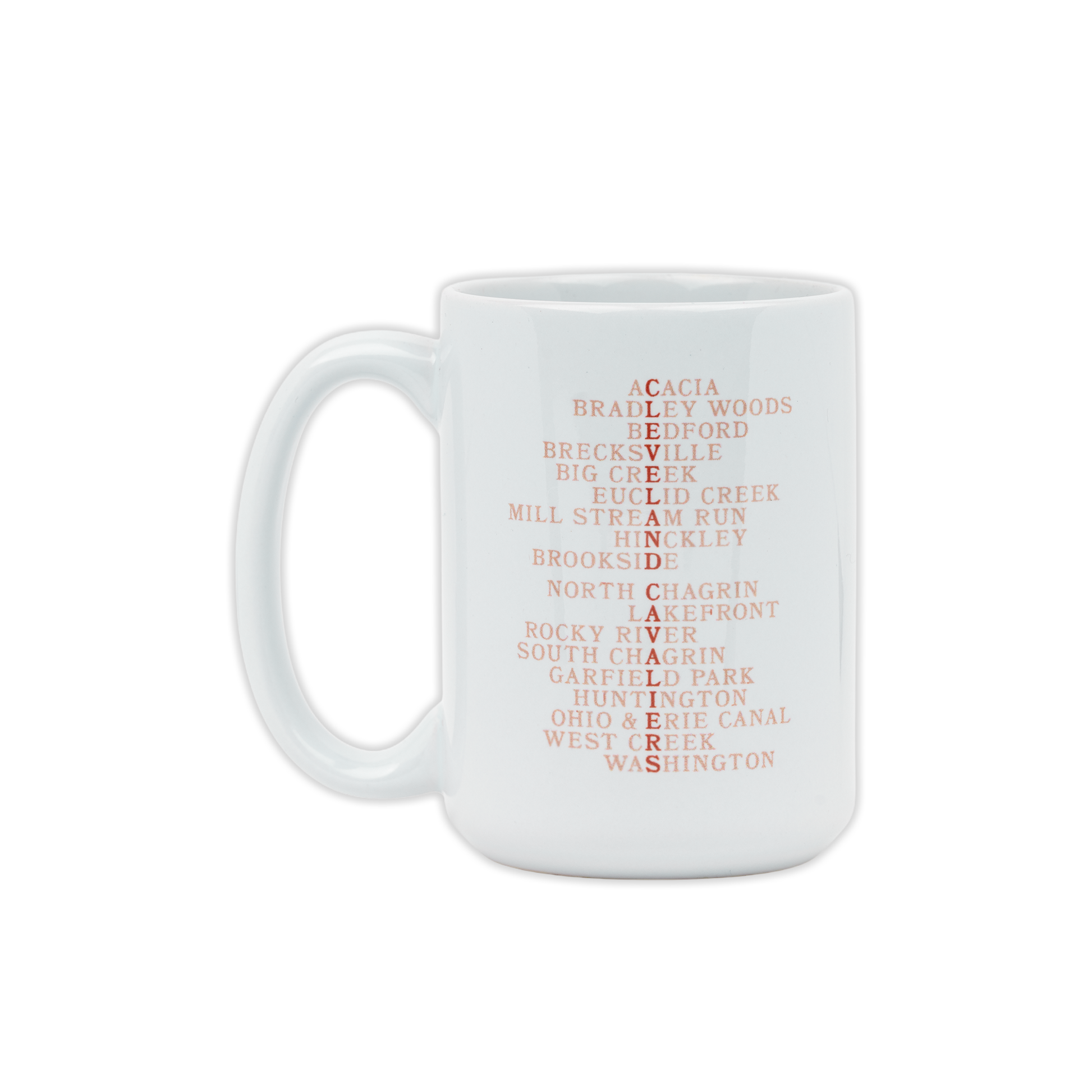 The back of the mug lists all of the beloved Cleveland Metroparks reservations.